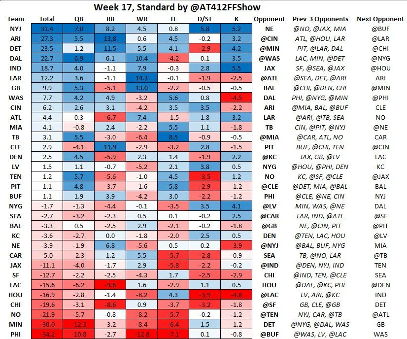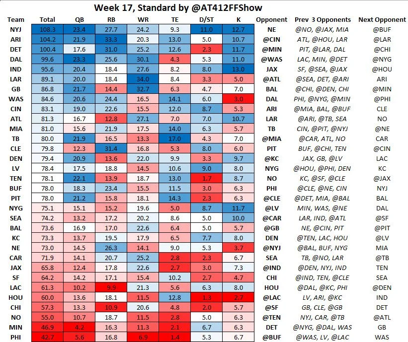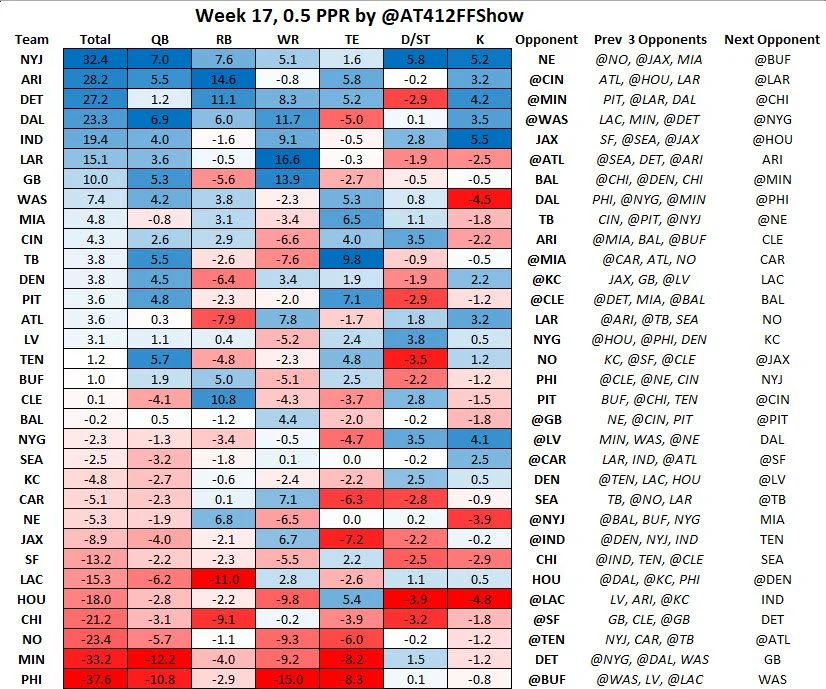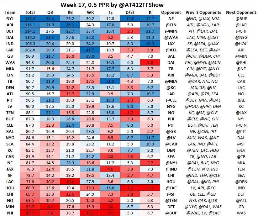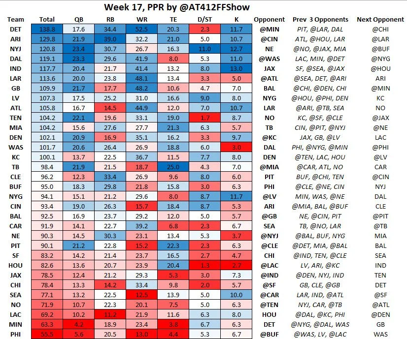 This data is showing the number of points allowed, so if you’re looking at QBs, the New York Jets are allowing a lot of PPG in the last 3 weeks (good matchup for Drake Maye) while the Minnesota Vikings are not (bad matchup for Jared Goff).